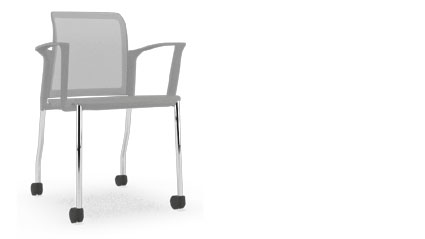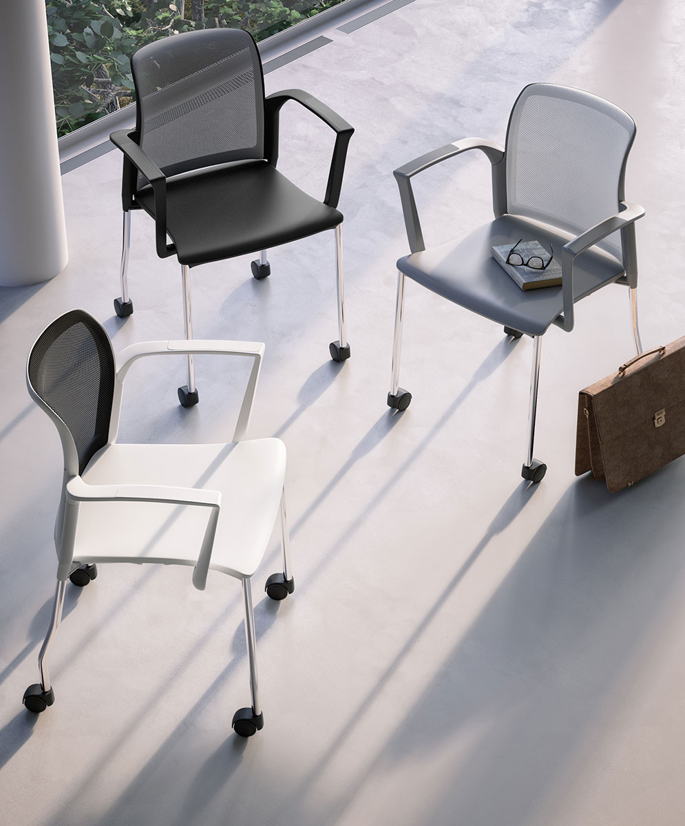 Stack armchair, polypropylene seat, mesh backrest, 4-legged chrome base on castors